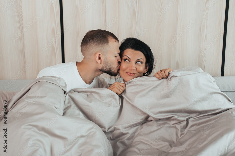 Young couple laying in bed kissing, playful brunette young woman in playful mood gets kiss from husband during honey moon. Fertility concept. Holidays at resort hotel. Leisure, travel, vacations.