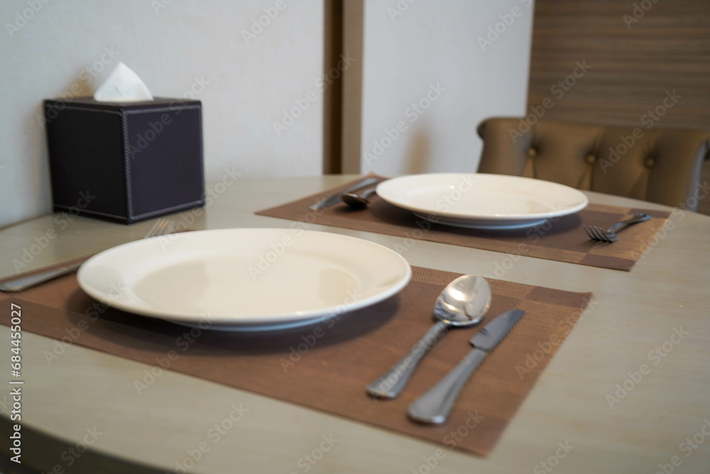 blurry and defocused of white ceramic dish on dining table in the house kitchen for dinner
