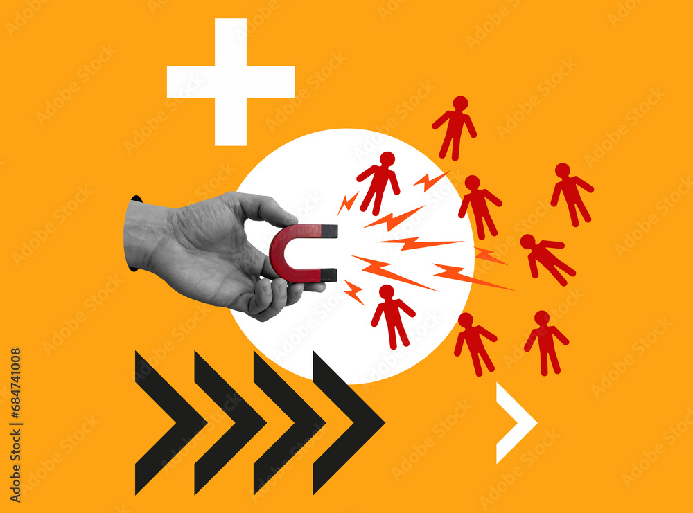 A hand with a magnet attracts figures. Retaining employees or attracting customers. Modern collage.