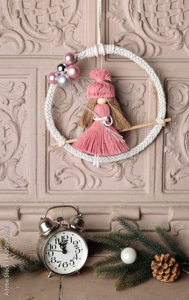 New Year's home decor. Interior design. A wreath on the fireplace, a vintage clock and fir branches.