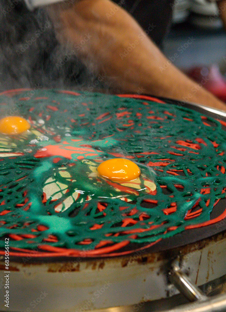 Asian multicolored pancakes made of layers of red and green. The cook breaks a raw egg into dough. Close-up