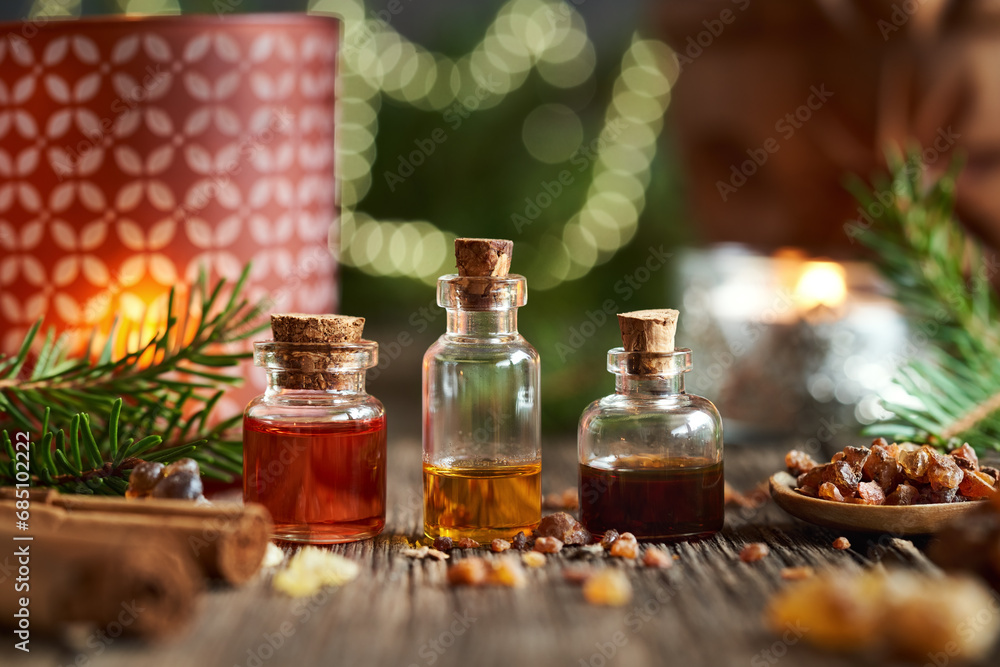 Bottles of essential oil with frankincense and myrrh resin at Christmas