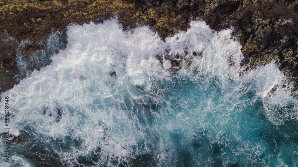 Drone view of Atlantic ocean with strong swell beating against the walls of a rocky cliff, blue rough sea with big waves with foam crashing against the rocks, south of Tenerife, Canary island