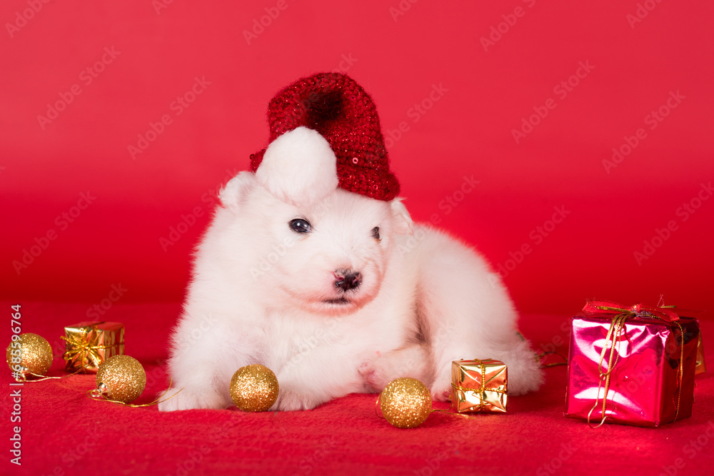 Christmas Santa puppy in a hat. Samoyed puppy dog on Christmas red background. Merry Christmas