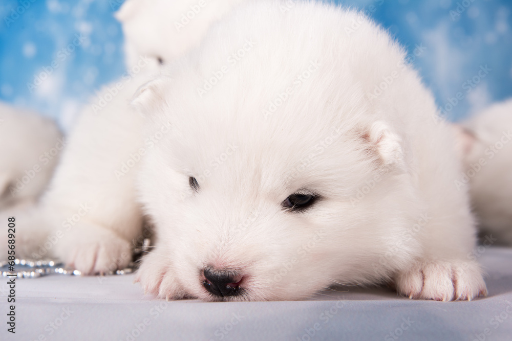 White fluffy small Samoyed puppy dog is sleeping on white background