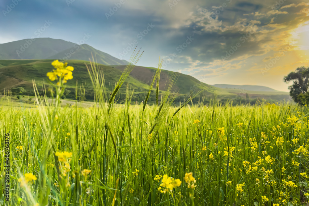 Flowery green fields in a mountain valley. Summer evening in the mountains.