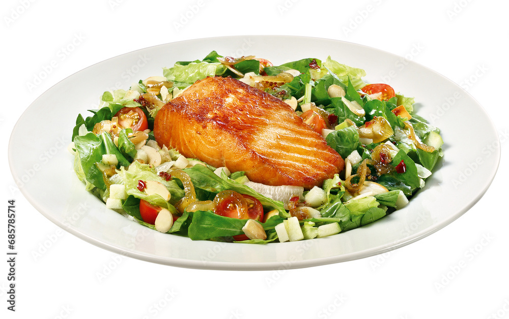 prato com salada de folhas verdes, queijo, tomate acompanhado salmão grelhado isolado em fundo trnasparente
