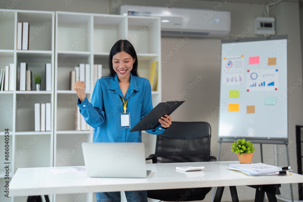 Business Asian woman are determined and excited about their work. Business success. Asian business women arms up after success job with customer