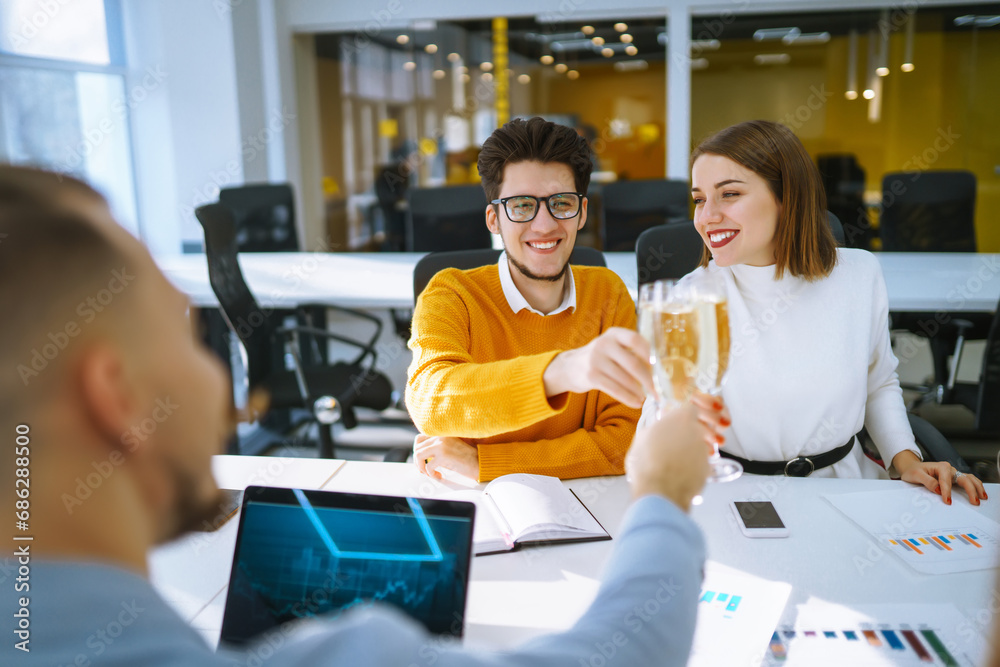 Business people celebrate with glasses of champagne in the office at a corporate event. A group of young people are having fun in the office. Holidays, business concept.