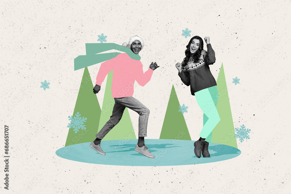 Creative magazine collage image of funky lucky guy lady walking enjoying xmas tine isolated beige color background
