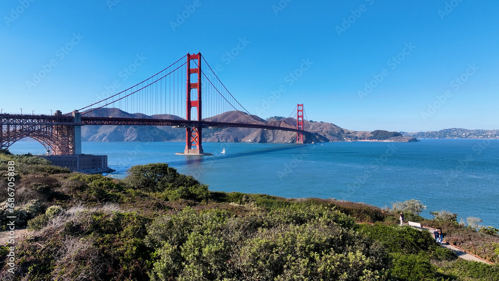 Golden Gate Bridge At San Francisco In California United States. Downtown City Skyline. Transportation Scenery. Golden Gate Bridge At San Francisco In California United States.