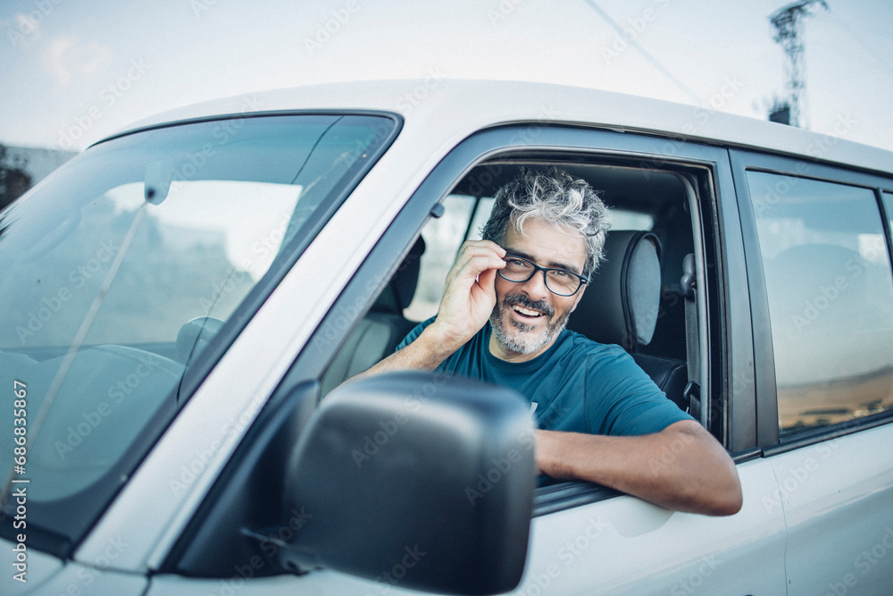 Smiling mature man sitting in his off-road vehicle