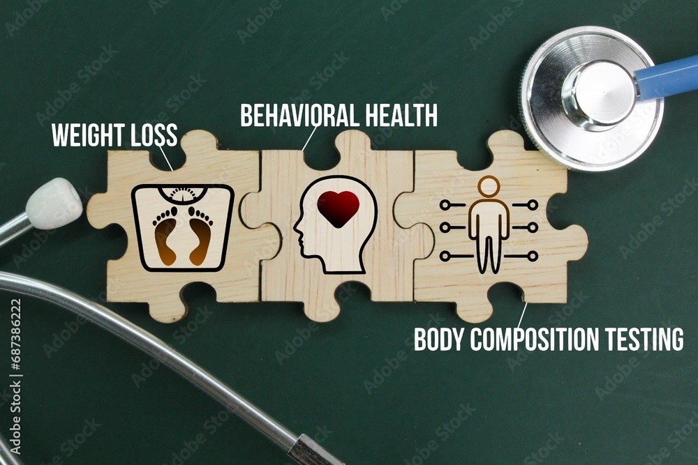 stethoscope and wooden puzzle with the three health must-haves which are Weight Loss, Behavioral Health and Body Composition Testing. Human healthy concept. Three healthy habits