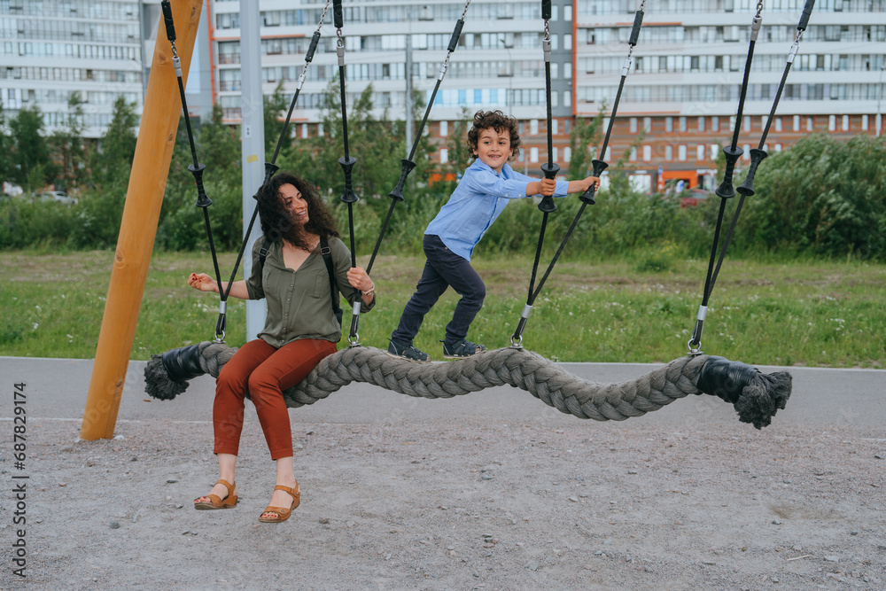 Active curly little boy riding on swing at playground with mom. Childhood, family leisure. Happy children.Young babysitter entertains little kid outdoors.