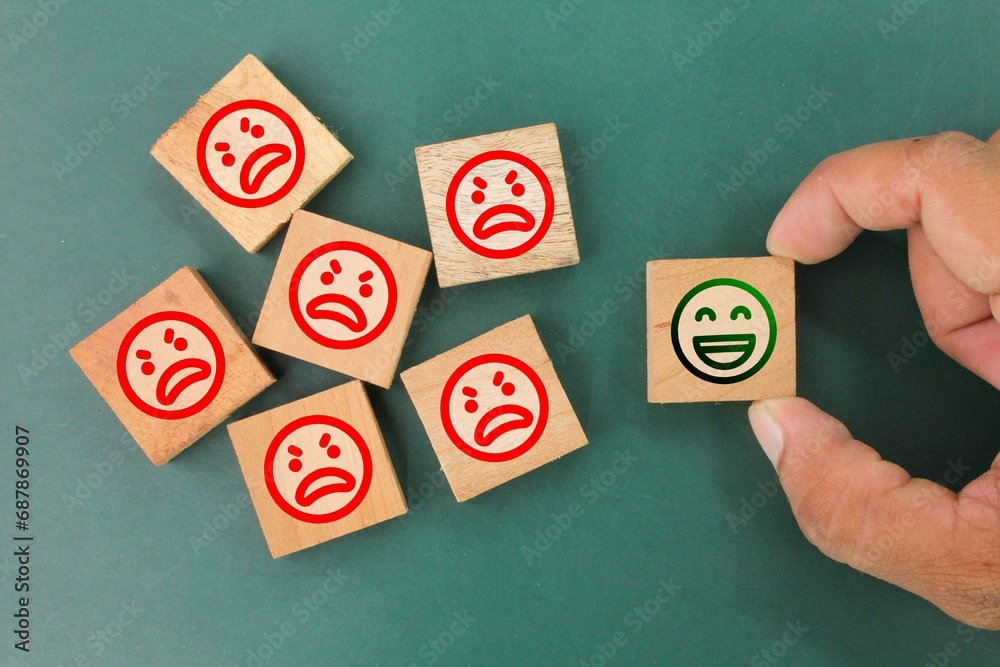 angry and smiley emoji. selected smiley emoji. customer service concept. hand flipping unhappy turning to happy symbol. Business and Happy smile concept.