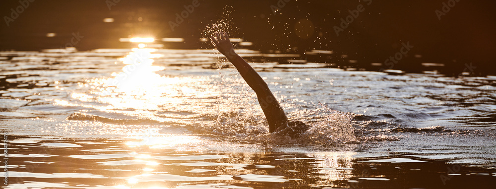 Triathlon athlete swimming on lake in sunrise wearing wetsuit