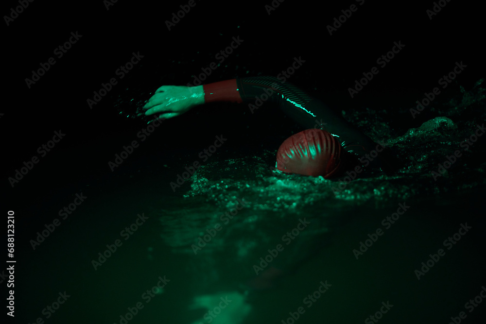 Authentic triathlete swimmer having a break during hard training on night neon gel light