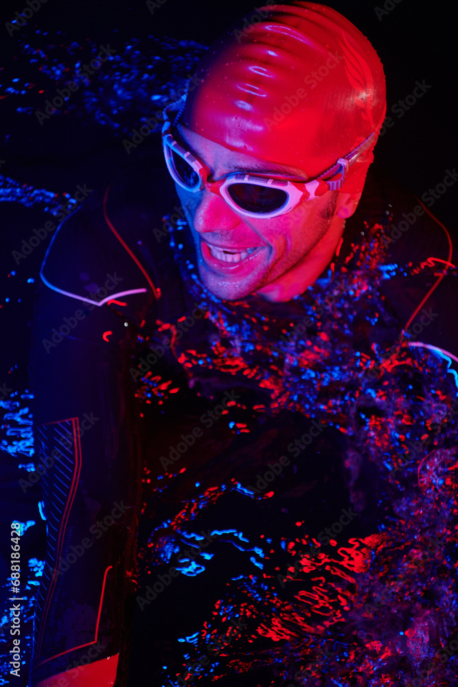 authentic triathlete swimmer having a break during hard training on night neon gel light