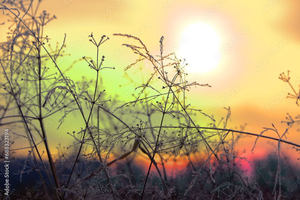 Close-up of dry winter plant. sunset, nostalgic calming natural background, majestic nature