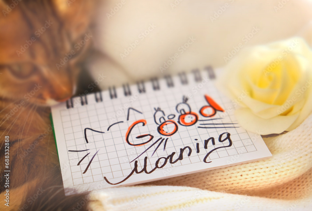Text Good Morning on paper, notepad and rose flower. Motivation. Pretty cute kitten relaxing on the window sill. Tabby cat. Funny pets. Atmospheric mood
