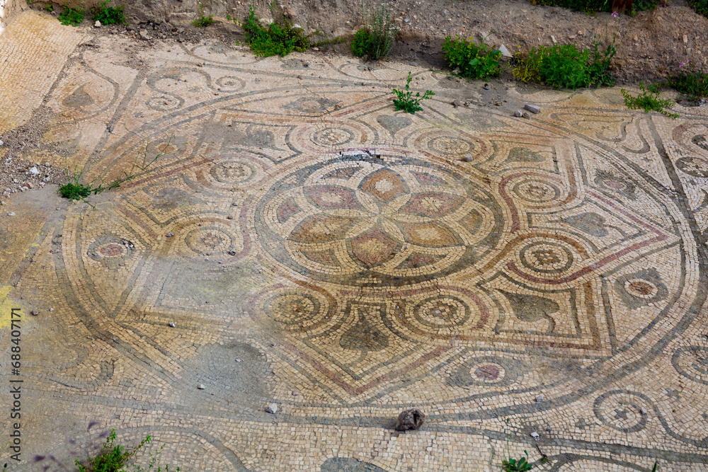 Remains of old colored mosaics on floor of ruined building in Turkish city of Arykanda. Art of ancient civilizations. Historical archaeological sites in Antalya province