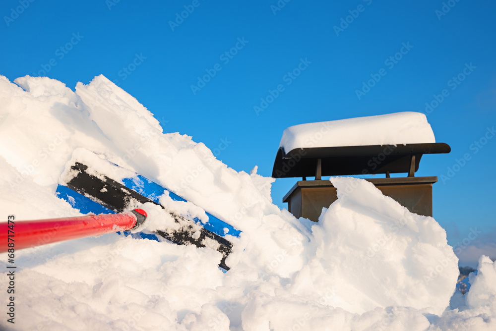 remove a lot of snow from the roof window with the snow shovel. blue sky and chimney