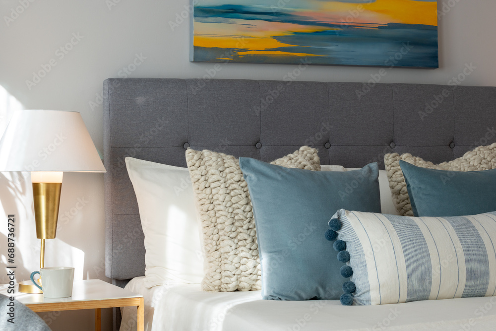 Relaxing bedroom scene with decorative gold lamp on bedside table near bed with pillows and nice side window sunlight beams.
