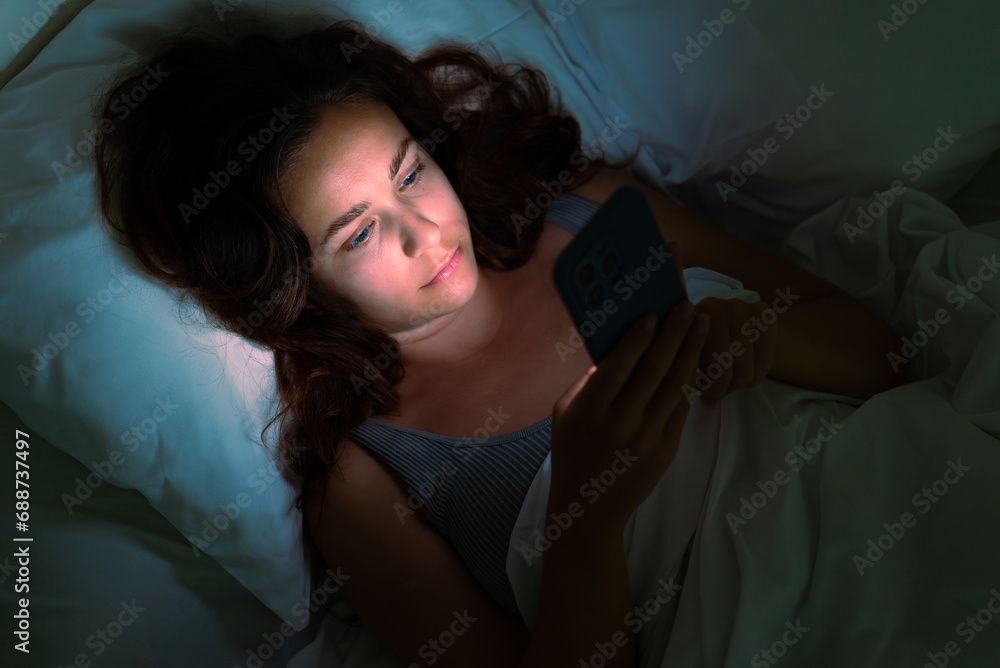 In the dim night, a woman lies in bed, absorbed in her phone's light, an illustration of insomnia and smartphone dependency.