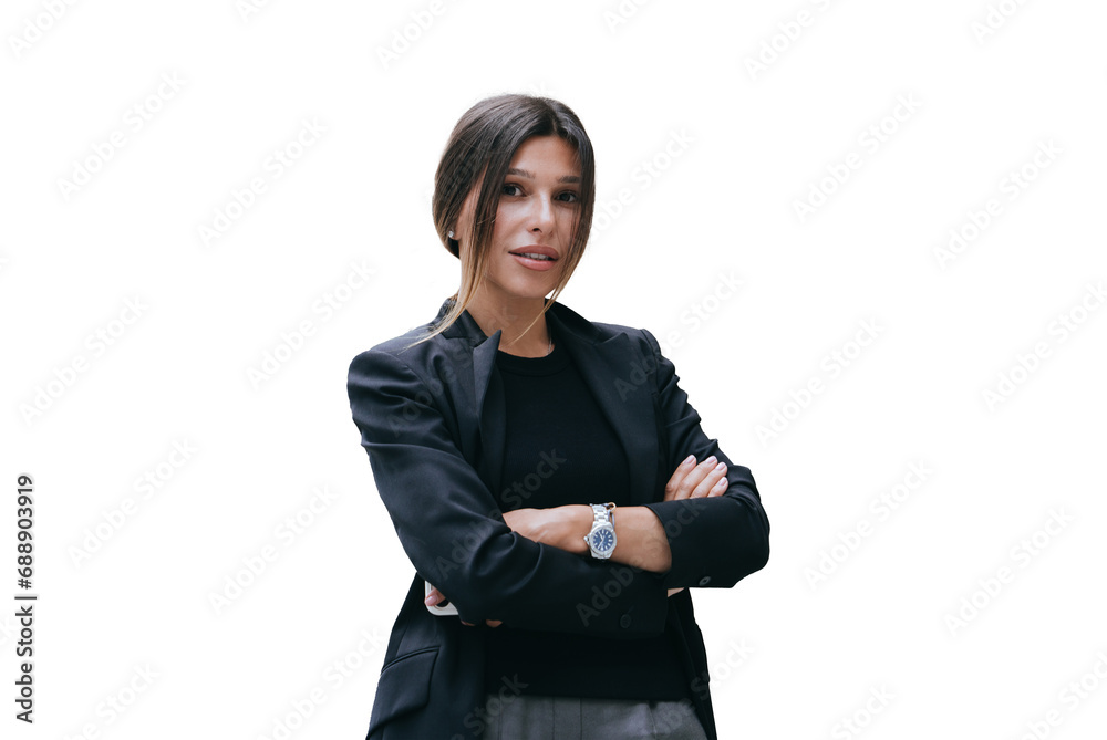 Confident businesswoman in black jacket against transparent background looks at camera against building with big columns. Female lawyer with folded hands on chest waits for partner. Financial people