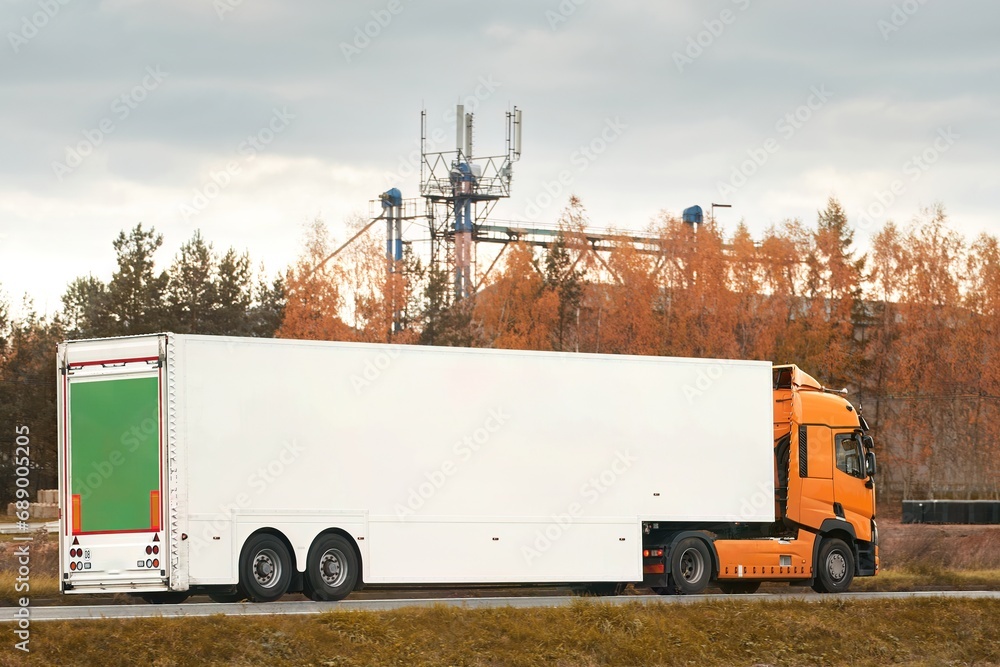 The modified double-decker European truck with additional cargo space and better aerodynamics. Sustainable future shipping concept better fuel efficiency and more cargo.
