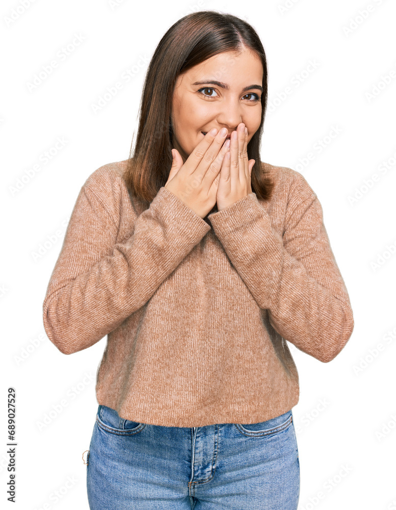 Young beautiful woman wearing casual clothes laughing and embarrassed giggle covering mouth with hands, gossip and scandal concept