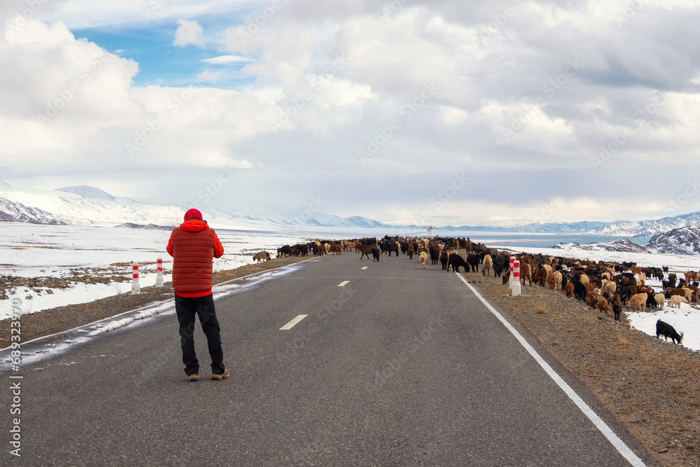 Big herd of sheep cross the road. Winter snow road to winter mountain. Winter snow rural road in Mongolia. Curious tourist got out of the car and take photos the congestion of sheep on the road.
