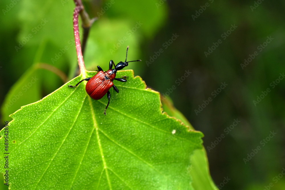 Red beetle Trachelophorus giraffa on green leaves.