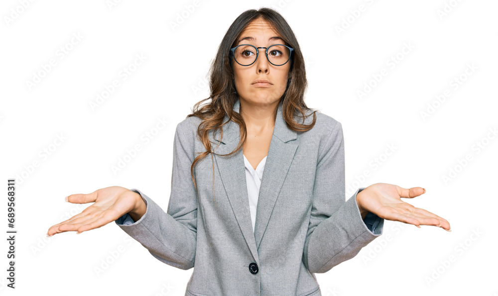 Young brunette woman wearing business clothes clueless and confused expression with arms and hands raised. doubt concept.