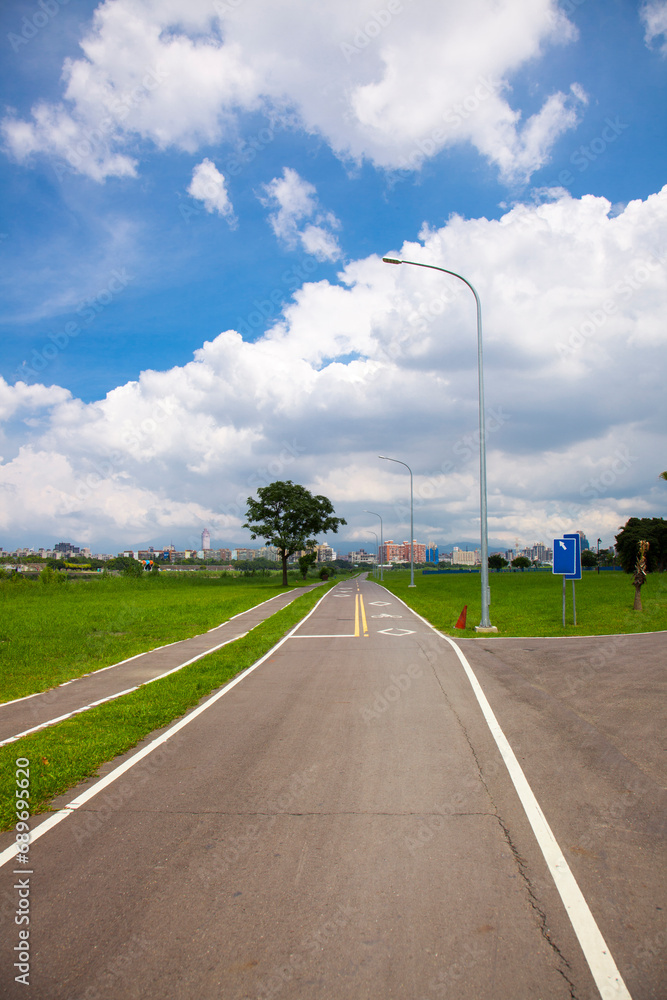 Blue sky and white clouds, river park, bicycle lane, bicycle, exercise