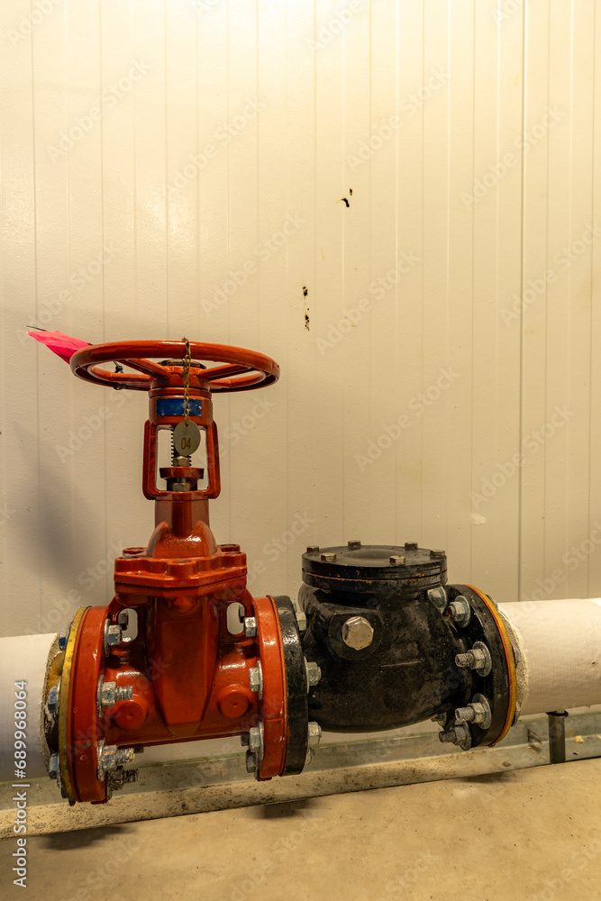 The interior of a mechanical room and a domestic potable water system with valves and connecting pipes.