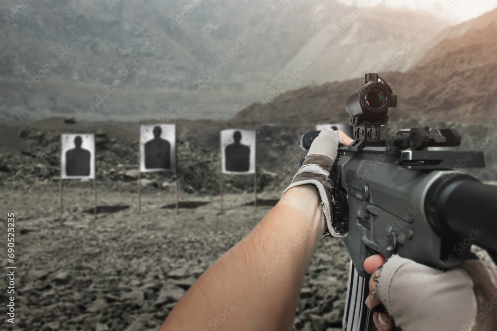 Assault rifle red dot target view, image of a rifle scope sight used for aiming with a assault weapon rifle at shooting range