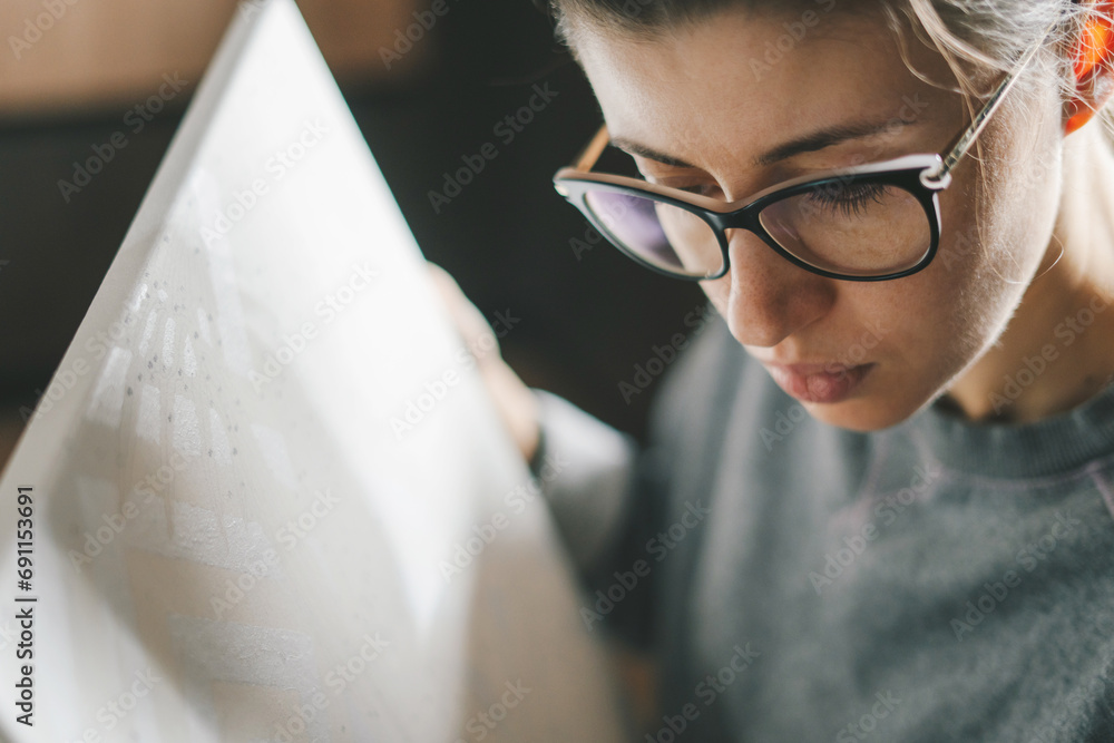 Close-up view of an attractive caucasian woman painting by numbers at home. Inspirational hobby and art therapy.