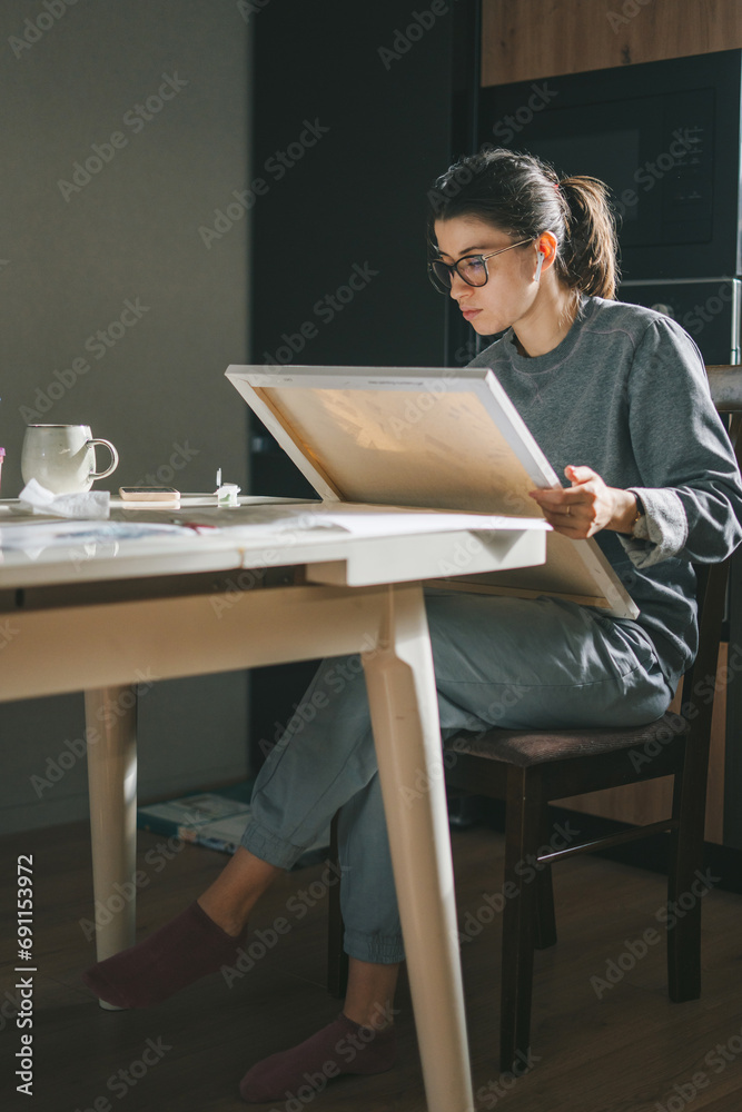 Adult woman painting by numbers indoors. Concepts of leisure activity, hobby and relax