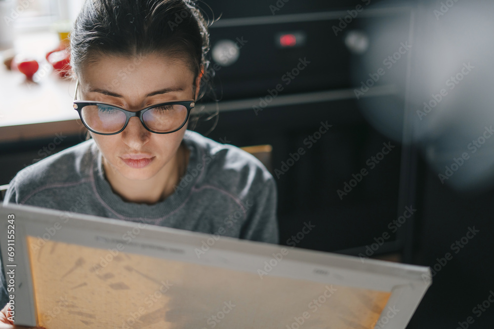 Woman with eyeglasses drawing picture by numbers with acrylic paints on canvas at home. Painting on canvas for beginners. Painting by numbers.