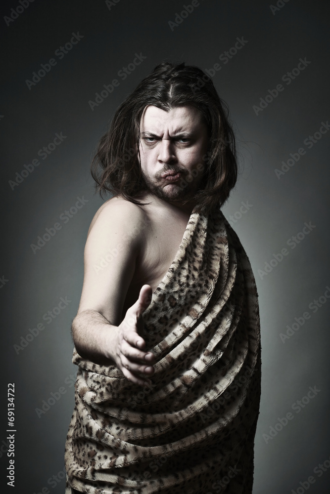 Savage man wearing leopard skin give a hand for handshake