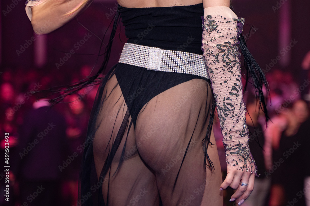 Sexy girl dancer posing on stage in a nightclub. Back view.