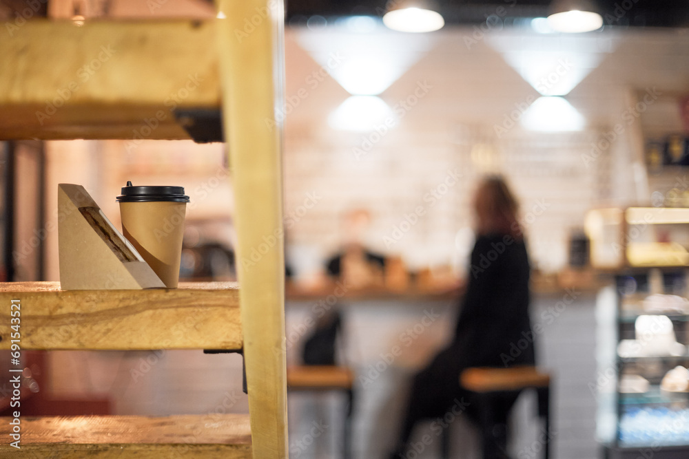 Sandwich and paper coffee cup takeaway in coffee shop. Tea to go