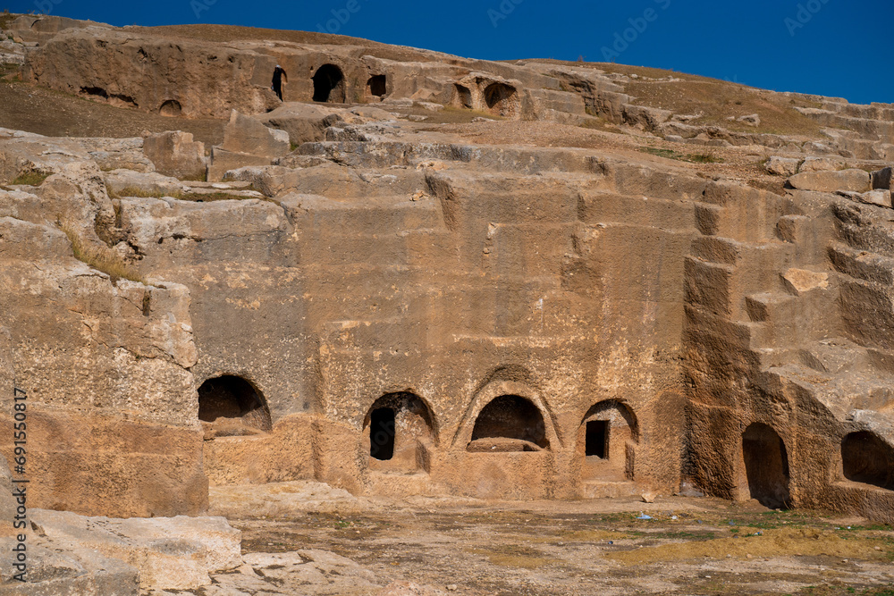 Ruins of rock cut building in Dara ancient city. Mardin, Turkey.