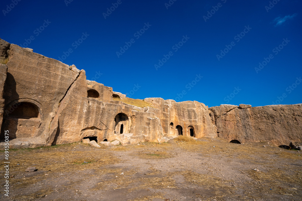 Ruins of rock cut building in Dara ancient city. Mardin, Turkey.