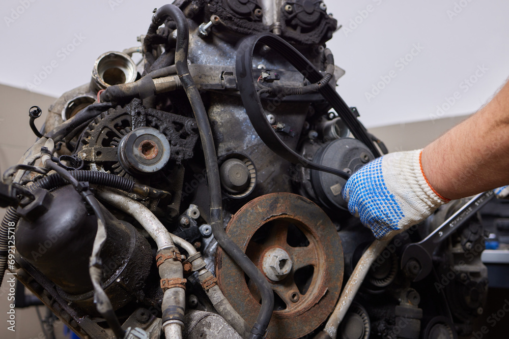 Engine valve car maintenance. The cylinder block of the four-cylinder engine. Disassembled motor vehicle for repair.