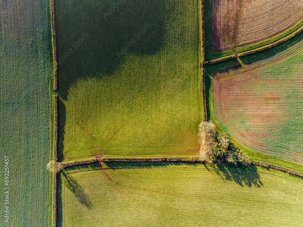 Top Down over Fields and Farms from a drone, Devon, England, Europe