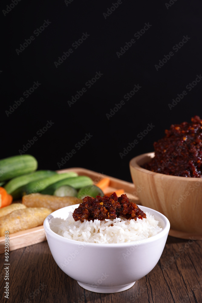 pork shrimp chilli dip local thai food sauce isolated in wood background