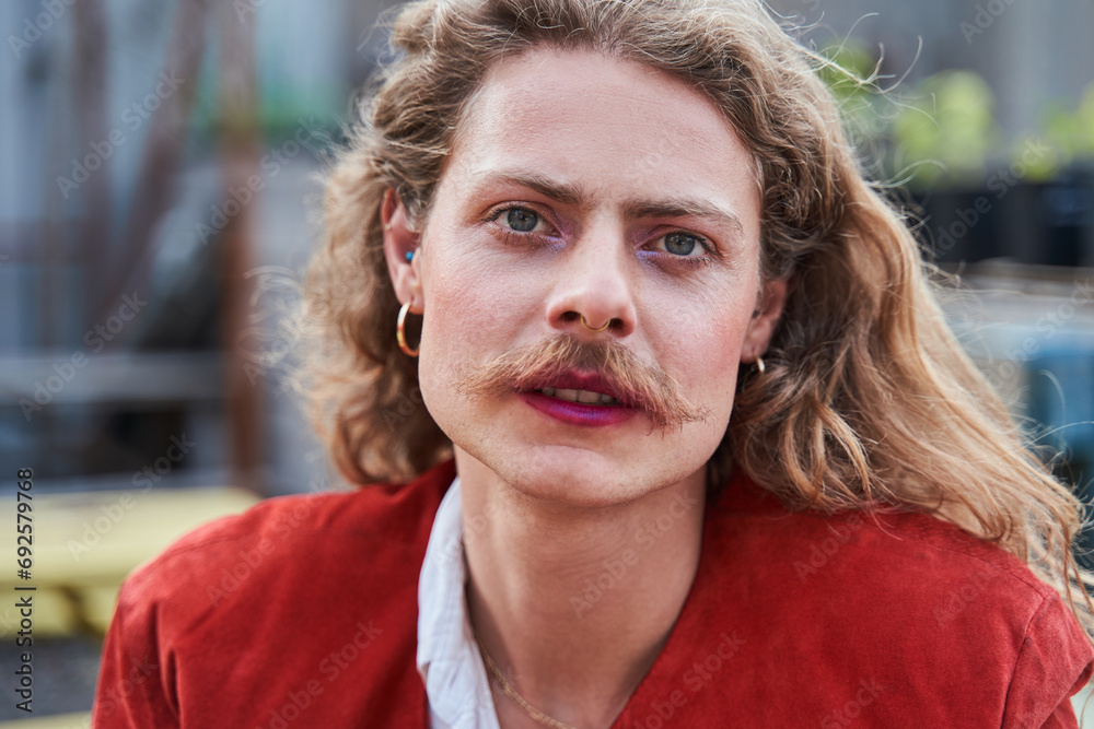 Portrait of the longhaired trendy man model in casual style red jacket posing at street