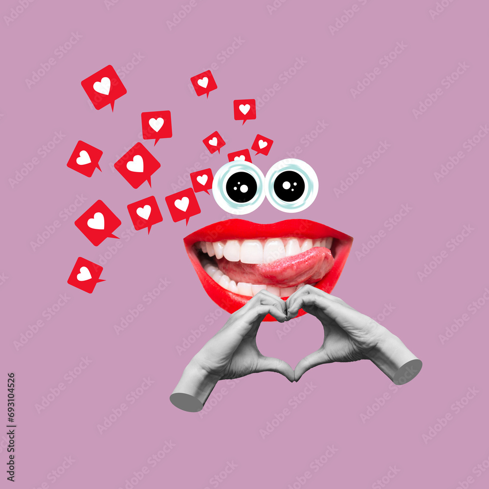 Smiling mouth with red lips showing tongue, statue's hands showing a heart shape, like symbols on purple color background. 3d collage, creative design